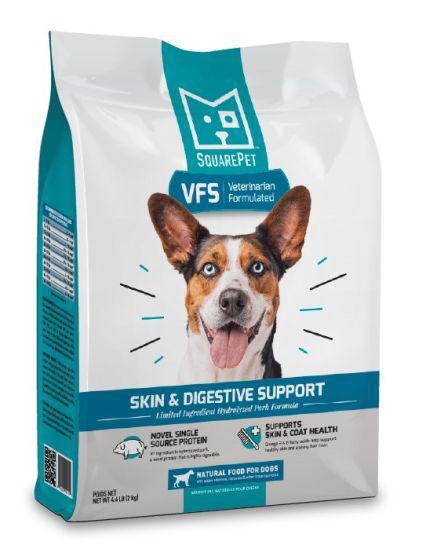 SquarePet VFS Skin & Digestive Support is a limited ingredient diet formulated by veterinarians using hydrolyzed pork—a protein broken down into small fragments to help dogs with food allergies or ingredient intolerances. The hydrolyzed protein is designed to be too small to trigger an immune response, reducing common symptoms like itchy paws and skin, hot spots, or ear infections. This diet is complete and balanced for adult dogs, and is available in dry, canned, and soft-baked treat formats—making it ideal for long-term feeding or elimination trials. All formulas use high-quality, responsibly sourced ingredients and are available without a prescription.